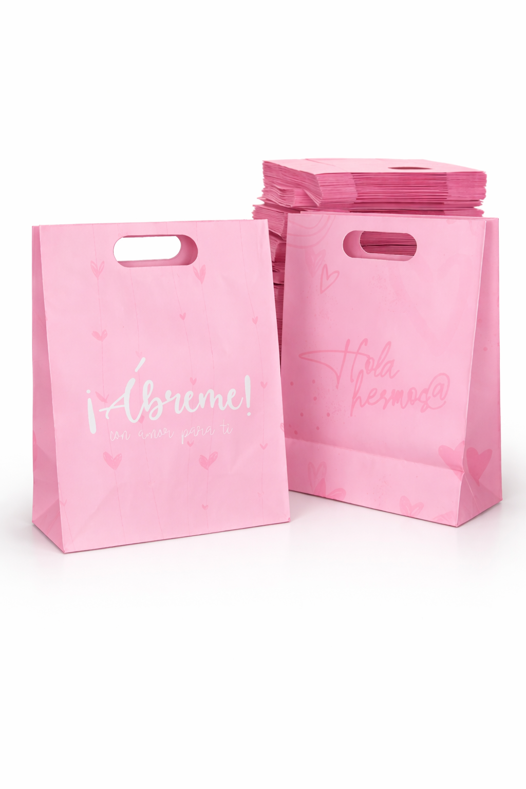 Dale un toque especial y encantador a tus compras con nuestras bolsas de regalo rosadas, diseñadas para enamorar desde el primer vistazo 💕.