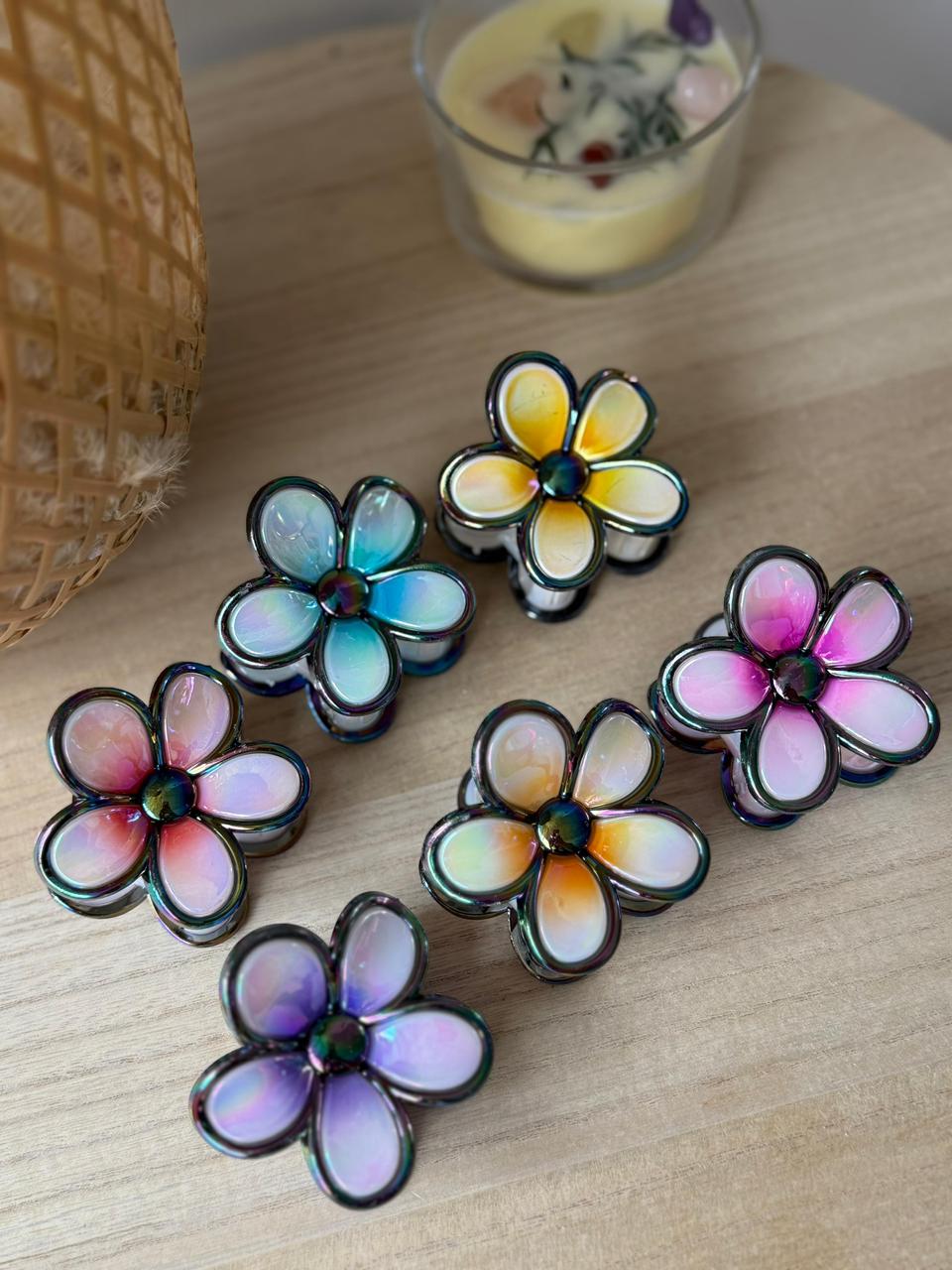 Pinza para el cabello con diseño de flor hawaiana en tamaño mediano y acabado tornasol, ideal para aportar un toque moderno, brillante y llamativo a tus peinados. Su efecto iridiscente cambia de tonalidad según la luz, destacando cualquier look.