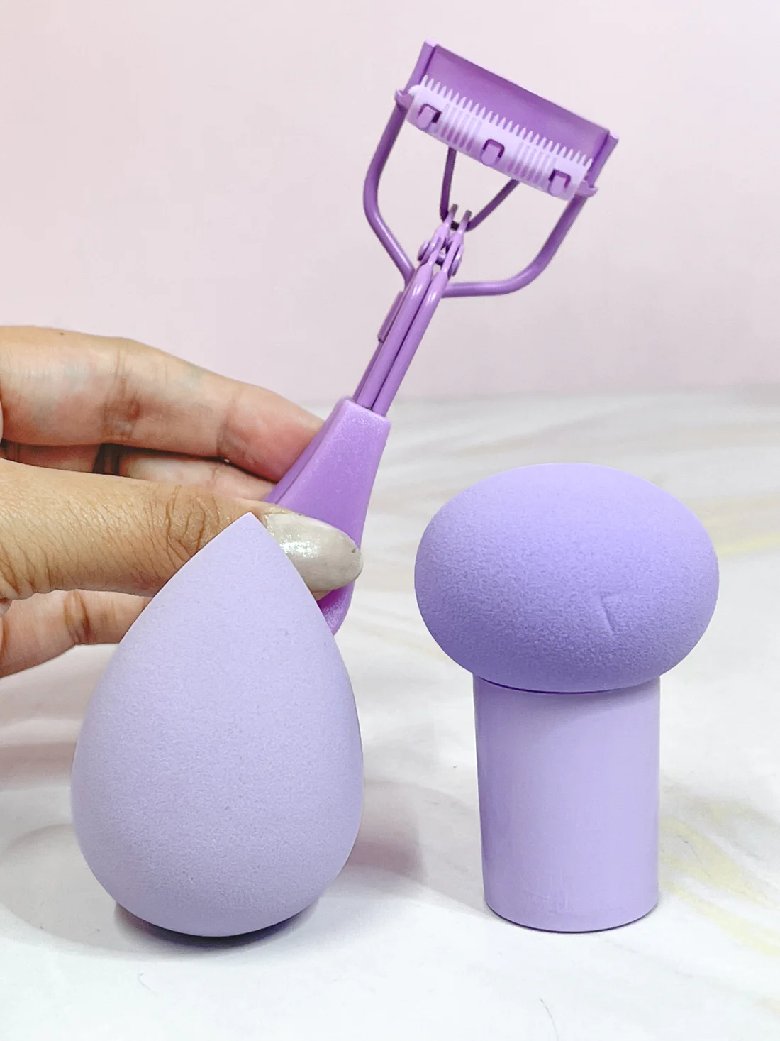 El encrespador brinda una curvatura natural sin maltratar las pestañas, mientras que la esponja permite aplicar base, corrector o productos en crema con un acabado suave, sin líneas ni acumulaciones.