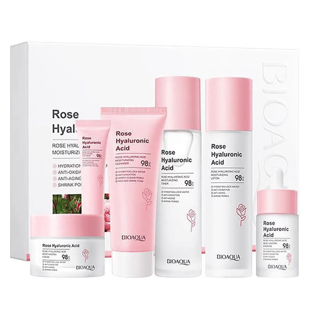 El KIT FACIAL ROSE HYALURONIC ACID BIOAQUA combina el poder hidratante del Ácido Hialurónico con las propiedades revitalizantes de la rosa, ofreciendo una rutina completa para una piel más suave, luminosa y profundamente hidratada.
