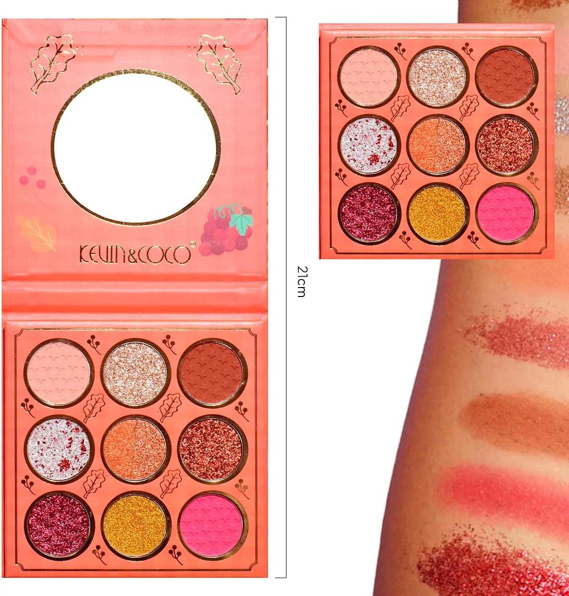 La PALETA DE SOMBRAS KEVIN & COCO 9 COLORES AUTUMN GLOW está inspirada en los tonos cálidos y vibrantes del otoño. Su combinación de rosados intensos, naranjas, dorados y brillos metálicos permite crear maquillajes llamativos y llenos de personalidad.