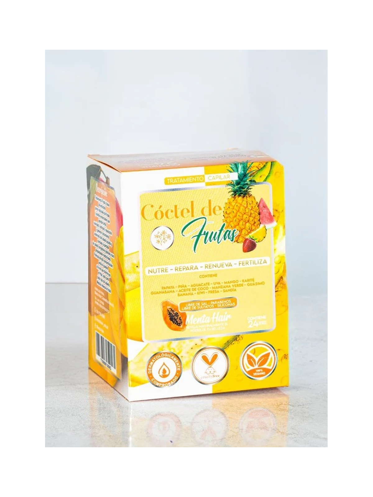 Con inulina, hidrolizado de yogurt, mantequilla de almendra de mango y copoazú, extracto de banano, papaya, maracuyá, coco, lúcuma, mango, uchuva y aguacate. Además, contiene aceite de zanahoria, chontaduro y cebolla roja.